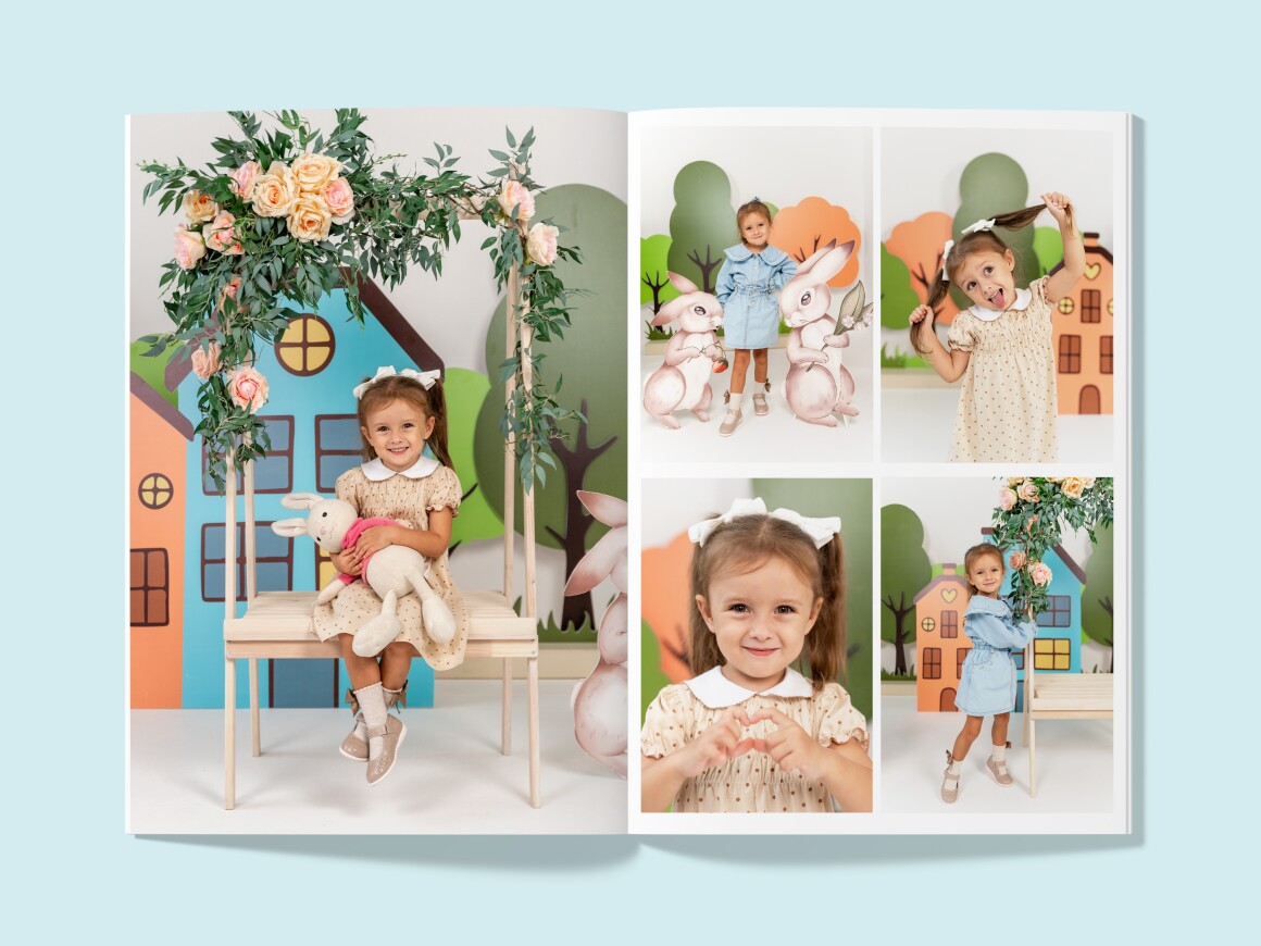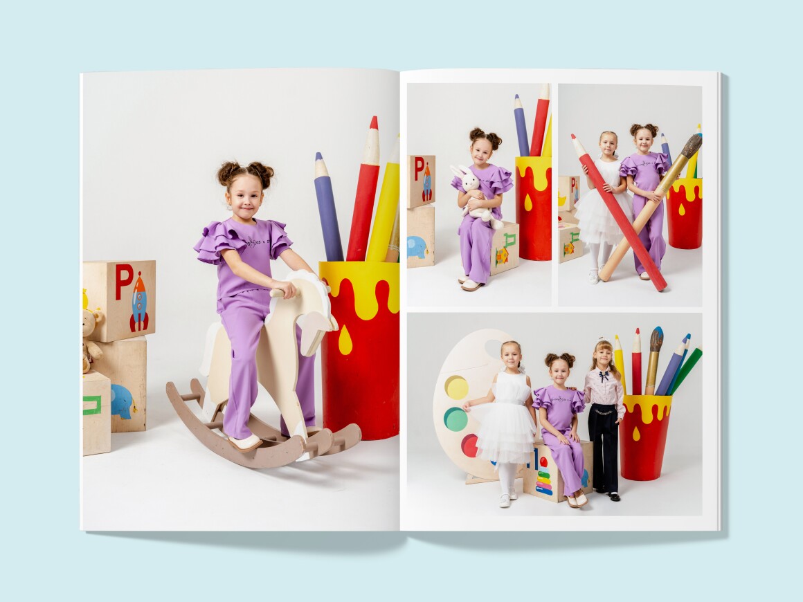 - 2 личных разворота, на всех фото Ваш ребёнок (4 портрета ребёнка + фото с друзьями)